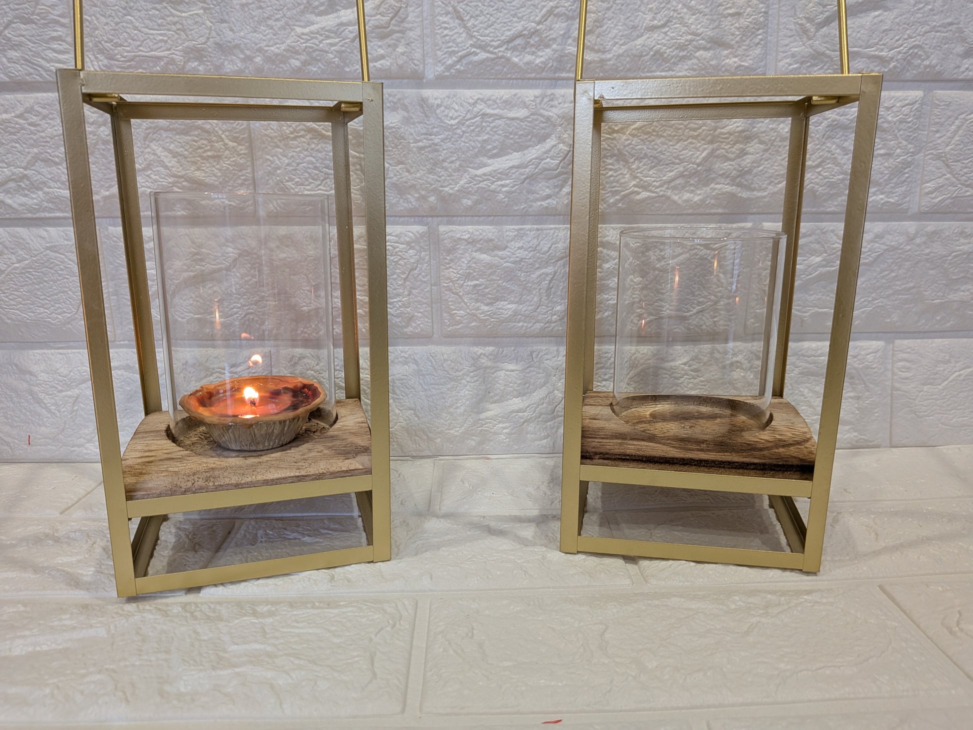Photophore design en métal doré avec plateau bois