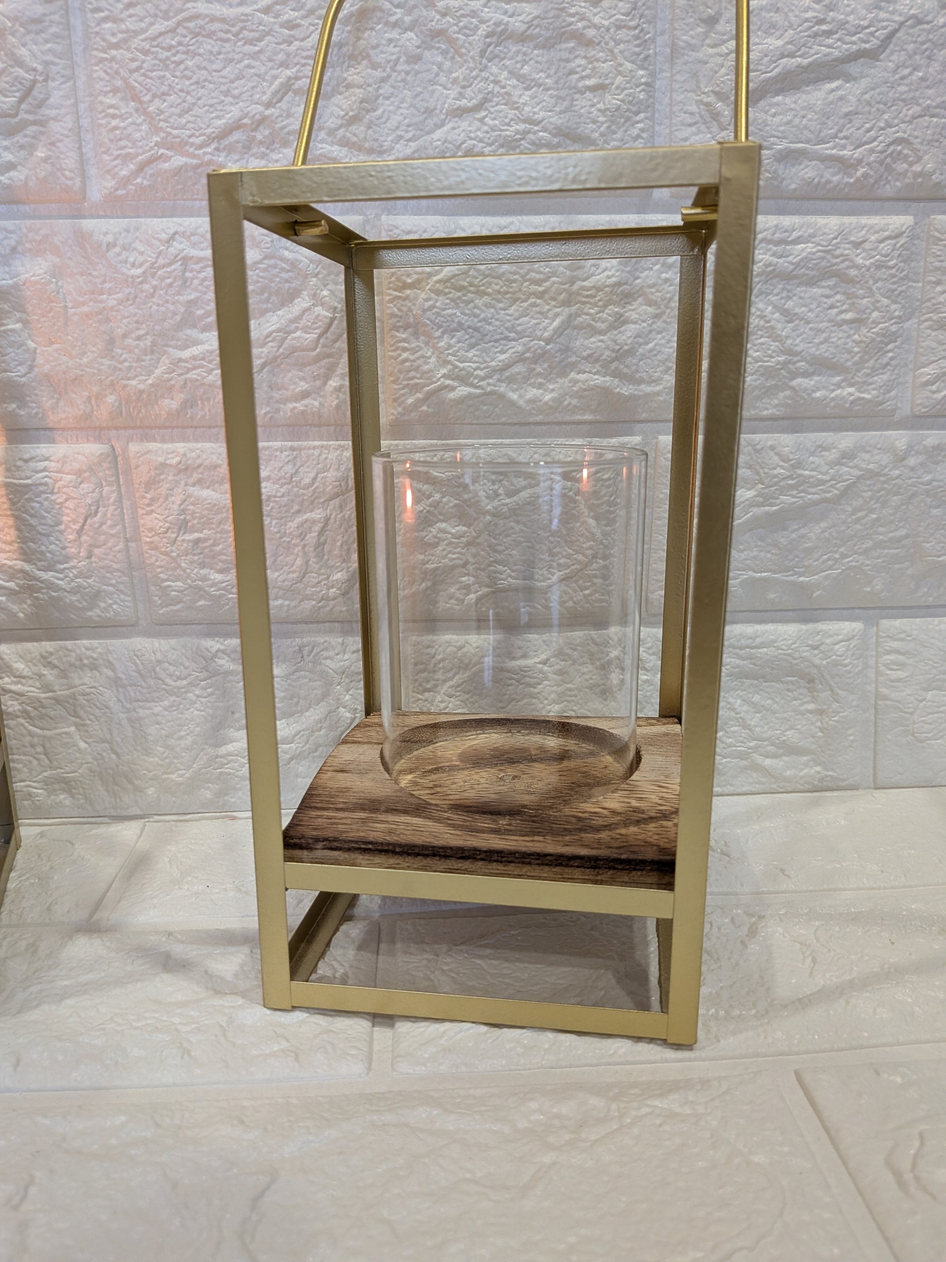 Ce photophore au design contemporain allie métal doré et bois naturel pour créer une pièce décorative élégante et chaleureuse. Sa structure épurée met en valeur la flamme de votre bougie et crée une ambiance raffinée et accueillante.